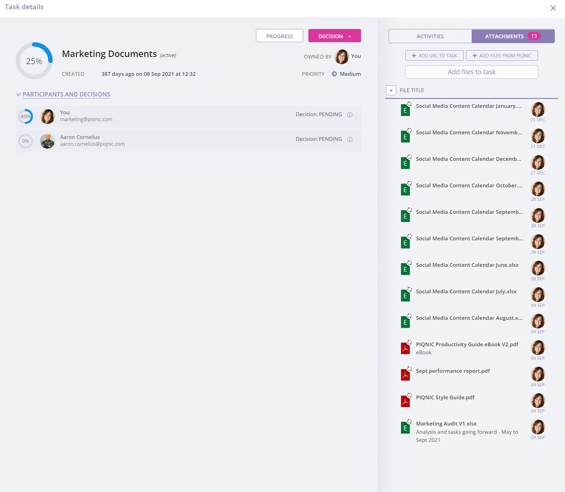 Moving document management to PIQNIC would create a core for her business that would smooth things out. She would have the PIQNIC team to help her set up and streamline the project management. This will eliminate software that she is paying for which are essentially duplications. Document management will happen in the same space as task management and project management. The latest document version is always easy to spot, and even easier to search for in PIQNIC with keyword search.